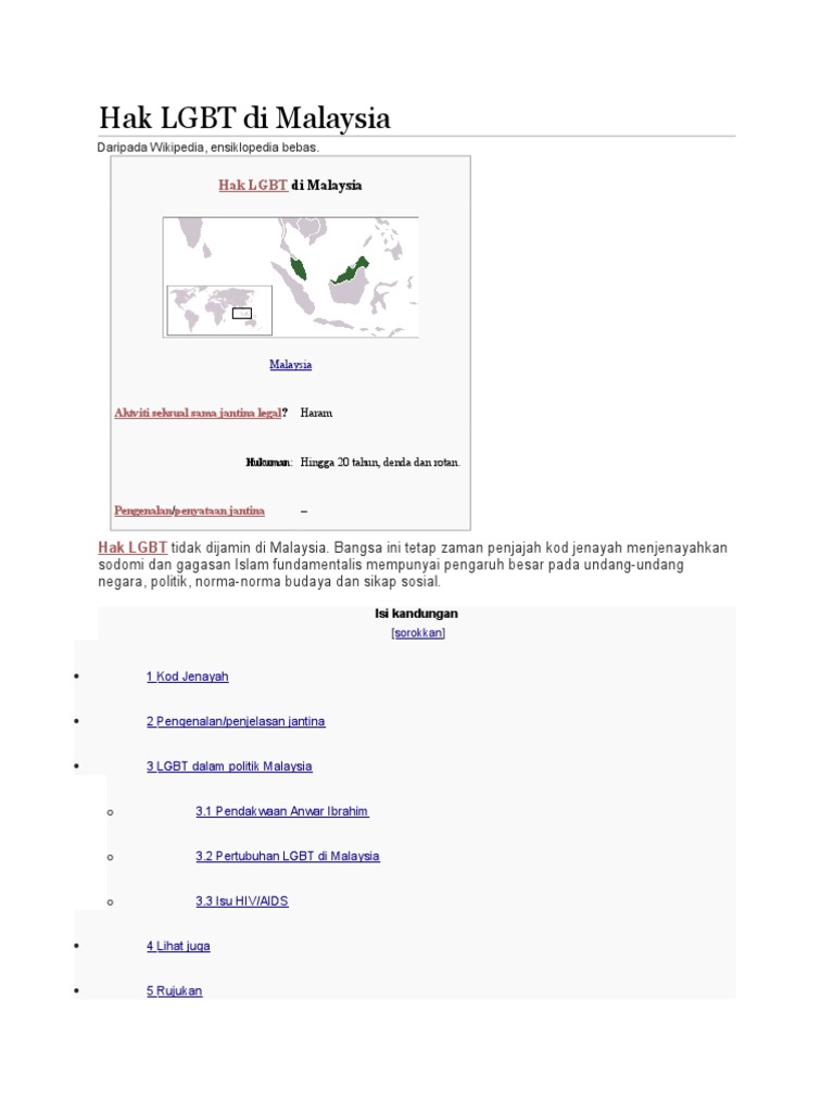 Ketika membentangkan perihal lgbt di kepala batas, pulau pinang anjuran jakim, jheaipp dan yayasan ihtimam minggu lepas, saya meneliti data dari amerika syarikat mengenai terdetik di hati, adakah malaysia akan mempunyai trend yang sama? Pdf drive investigated dozens of problems and listed the biggest global issues facing the world today. Please copy and paste this embed script to where you want to embed. Meski kontes itu tak berlangsung. Pengenalan pada alaf 2012, malaysia dikejutkan dengan isu gerakan kemanusian yang ingin diperjuangkan kebebasannya di malaysia. 5 penyebab lgbt lesbian, gay, biseksual, serta transgender yang perlu diketahui untuk selalu menjaga diri agar tidak terjerumus dalam lgbt. Load more similar pdf files. Lgbt rights in malaysia (q1626330). Hingga 20 tahun,denda dan rotan. Liwat adalah jenayah di negara ini, dan sikap sosial terhadap komuniti lgbt dibentuk oleh islam, agama rasmi negara malaysia. Some groups are independent, some are more radical than others, some are aligned with other bigger umbrella or religious organizations. Ketika itulah rakyat malaysia akan katakan: So please help us by uploading 1 new document or like us to download