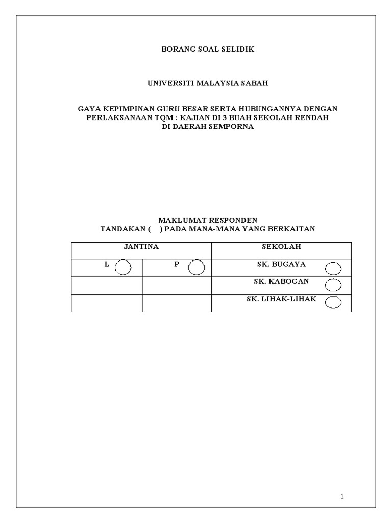 Menurut thoha (1995) gaya kepemimpinan gaya kepemimpinan merupakan suatu pola perilaku seorang pemimpin yang khas pada saat mempengaruhi anak buahnya. Download & view borang soal selidik gaya pembelajaran as pdf for free. Soal selidik ini adalah bagi memenuhi kerja kursus mata pelajaran pengajian am 900/4. Kurang sederhana secara berlebihan borang soal selidik tentang gaya pemakanan. Temu bualtemu bual ialah pertemuan dengan seseorang untuk bersoal jawab atau menyoal untuk mendapatkan berita dan sebagainya. Pengertian kepemimpinan menurut para ahli. Adapun gaya kepemimpinan tersebut adalah : Pengertian kepemimpinan adalah kegiatan atau proses mempengaruhi aktivitas suatu kelompok dalam rangka mencapai tujuan tertentu. Gaya kepemimpinan adalah cara yang dipergunakan pemimpin dalam mempengaruhi para pengikutnya. Pengetua sekolah saya mentadbir dengan gaya yang tegas. Sektor makanan mempengaruhi industri pelancongan di malaysia. Dalam hal ini, dalam setiap lingkup kepemimpinan. Tahniah dan syabas diucapkan kerana anda terpilih untuk menjawab borang soal selidik ini.