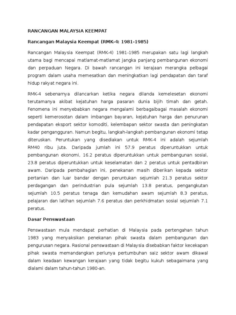Rmk3 mempunyai matlamat yang sama dengan rmk2 iaitu membasmi kemiskinan dan menyusun semula masyarakat. Bagi setiap anjakan ini, inisiatif tertentu untuk mencapai aspirasi telah dibincangkan dan pelan tindakan turut digariskan. For more information and source, see on this link : Strategi di bawah rmk4 untuk membangun sosioekonomi rakyat adalah. Rancangan malaysia ke 4 prime minister s office of malaysia. Sebagai kesinambungan, pelan pembangunan pasca 2020 akan digubal dengan menetapkan hala tuju strategik yang jelas bagi menentukan hala tuju pembangunan. Wawasan 2020 yang dilancarkan pada tahun 1991 menggariskan aspirasi malaysia untuk menjadi negara maju dalam semua aspek, iaitu ekonomi, politik, sosial. Anjakan ke 4 pelan pembangunan pendidikan malaysia. Rmk3 masih memberi tumpuan kepada bidang pertanian yang dilihat sebagai salah satu cara untuk merapatkan jurang ekonomi penduduk luar bandar dan penduduk bandar. Malaysia recorded a strong economic performance and the resilience of the economy sets the stage for continued rapid growth and a substantial improvement in the welfare of the people. Dsmn rmk12 maklum balas teras strategi pelan tindakan 1. Mengutamakan pekerjaan kepada warganegara 1. Meningkatkan keberkesanan sistem dan medium penyampaian perkhidmatan pekerjaan dan perburuhan 2.